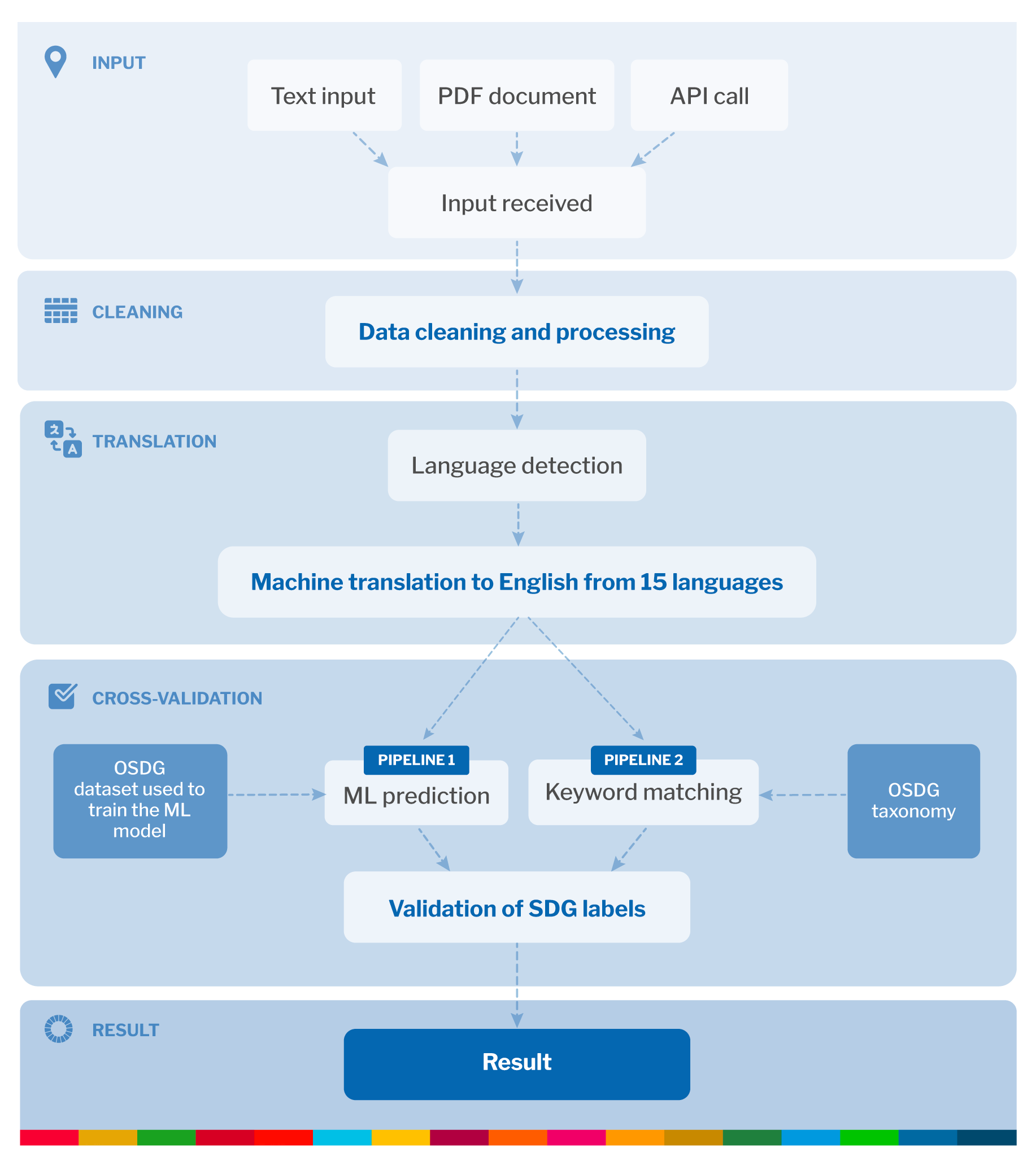 The OSDG team curates an API, which allows to automatically assign SDG labels to both text snippets and documents. API access is offered free of charge to scholars, conducting research that would be made available to the public in the form of a journal publication, conference paper, etc.