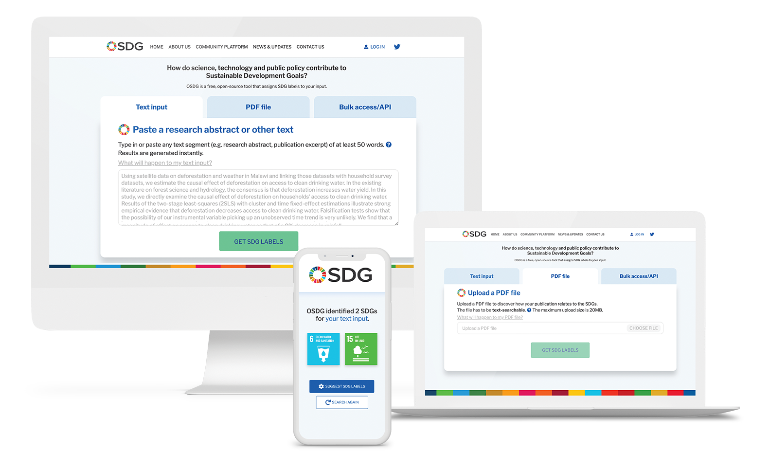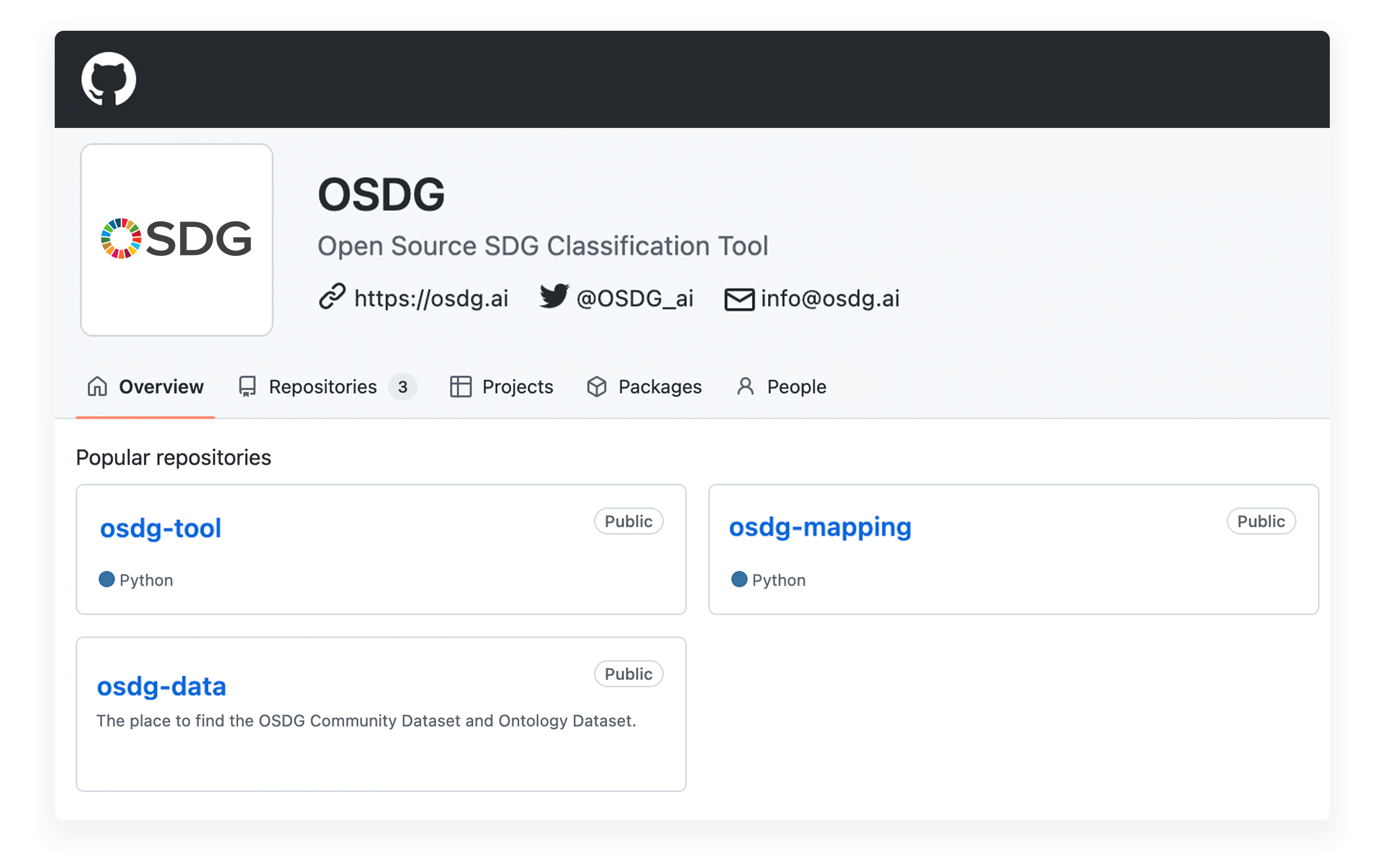 OSDG is an open source initiative that aims to integrate various existing attempts to classify research according to Sustainable Development Goals, and to make this process open, transparent and user-friendly.