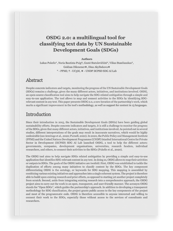 Pukelis, L., Bautista-Puig, N., Statulevičiūtė, G., Stančiauskas, V., Dikmener, G., & Akylbekova, D. (2022, November 21). OSDG 2.0: A multilingual tool for classifying text data by UN Sustainable Development Goals (SDGs). https://doi.org/10.48550/arXiv.2211.11252
