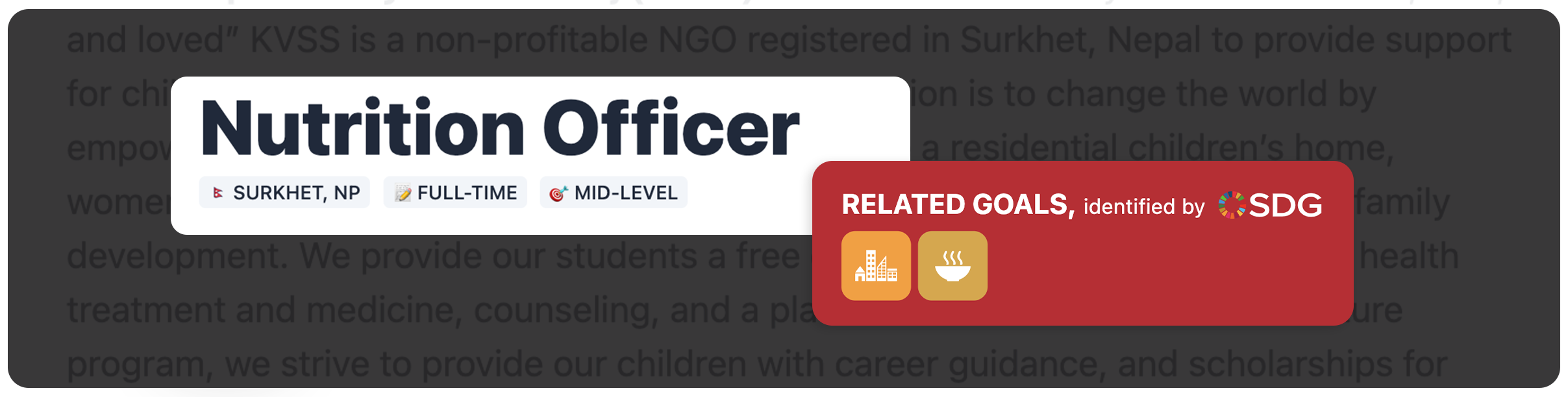 Our tool runs the entire vacancy text and matches SDG-relevant content to the most relevant Global Goal. For instance, a quick search for positions under SDG7 (Affordable and clean energy) returns opportunities for solar technicians, renewable energy analysts, carbon capture engineers, and more. The job vacancies are then listed on a board, where users can use filters to find the announcements that match their specific interests.