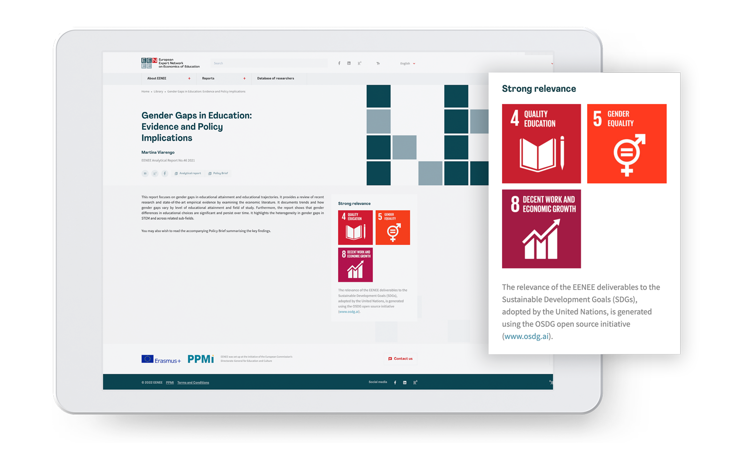 In the image below we display an example of how EENEE showcases SDGs for each publication. According to the OSDG methodology, the analytical report “Gender Gaps in Education: Evidence and Policy Implications” by Martina Viarengo is strongly linked to Goal 4– Quality Education, Goal 5 – Gender Equality, and Goal 8 – Clean Water and Sanitation.