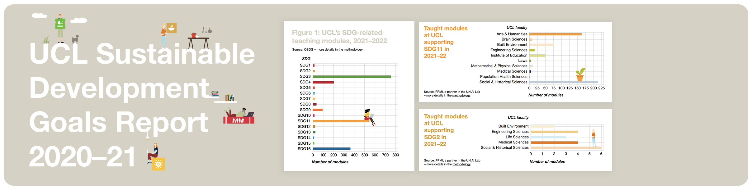 Based on our estimations, teaching modules across UCL particularly align with SDG 3 (Good Health and Well-being), SDG 11 (Sustainable Cities and Communities), and SDG 16 (Peace, Justice and Strong Institutions).