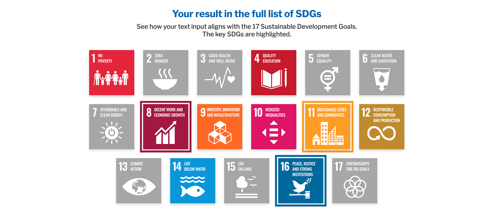For each input that returns at least one SDG label, OSDG will show an interactive chart with a detailed breakdown. We have also updated the Full list of SDGs to represent both the key SDGs (displayed in a highlighted frame), as well as the additional ones.